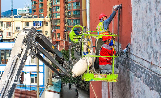 2025年11月3日,安徽省蕪湖市繁昌區繁陽鎮,工人正在對一老舊小區居民樓外墻面進行施工作業。