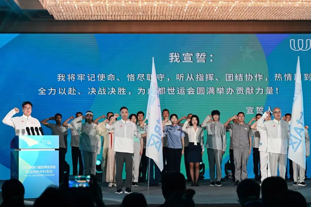 當日上午,一場簡約而又精彩的開村活動在天府國際大酒店開啟。國際世運協(xié)(IWGA)、參賽客群、世運村工作人員、志愿者等200余名各方代表齊聚現(xiàn)場。伴隨著象征團結與奮進的《榮耀之路》樂聲,參賽者代表與憨態(tài)可掬的大熊貓、川金絲猴人偶攜手步入會場,現(xiàn)場氣氛熱烈。舞臺巧妙融合五大洲文化符號與運動元素,展現(xiàn)出一幅多元共生、和合交融的動人畫卷。