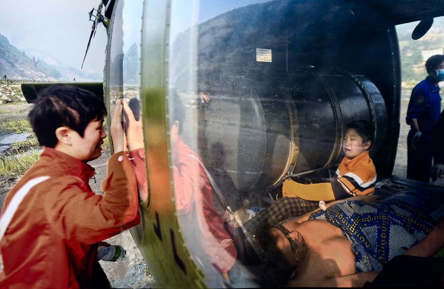 居揚是第八屆范長獎新聞獎獲得者。圖為她拍攝的2008年5月16日,四川省汶川縣映秀鎮,母親吳澤會隔著救援直升機的窗玻璃與兒子告別時的情景。