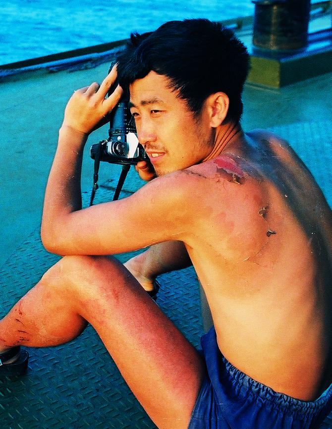 于文國是第十三屆范長江新聞獎獲得者。圖為他拍攝的是一位在洪水中搏斗了兩個小時后的武警戰士的脊梁。