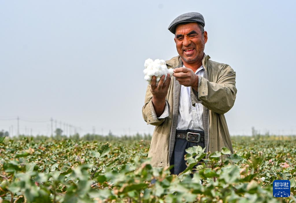 9月19日,尉犁縣達西村二組村民艾合買提·吐爾遜在棉田里查看棉花。新華社記者 陳朔 攝pagebreak