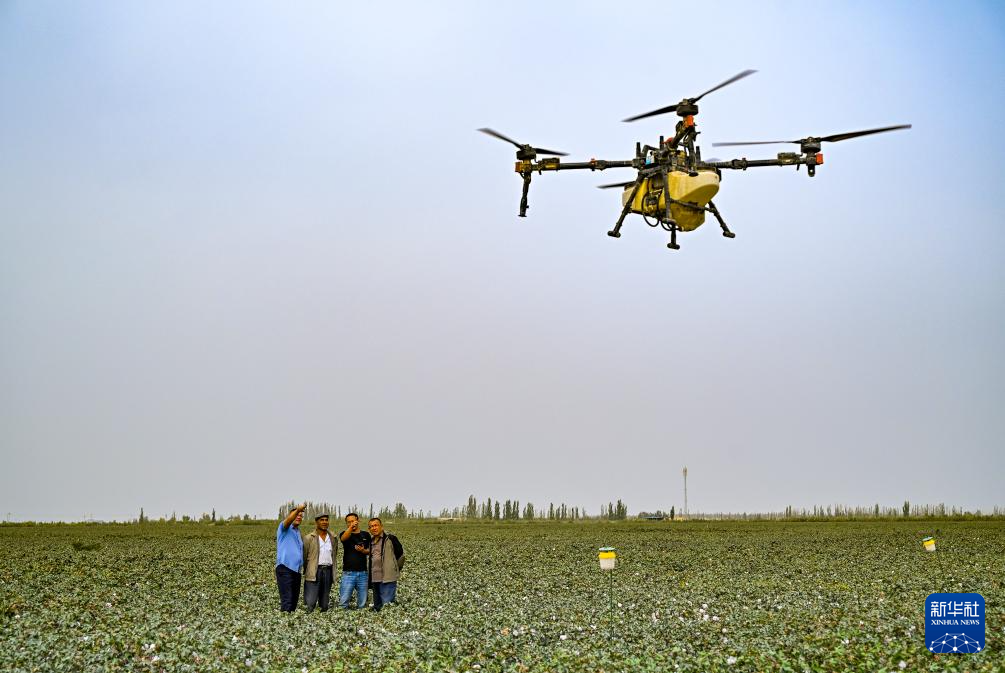 9月19日,極飛超級棉田負責人艾海鵬(右二)在尉犁縣的示范棉田里為達西村村民進行智能無人機灑藥培訓。無人化智慧農場應用農業無人機、農業無人車、遙感無人機、農機自駕儀等系列物聯設備實施“水肥一體化”管理,農民用一部手機即可操作智能設備完成多項田間管理工作。新華社記者 陳朔 攝pagebreak