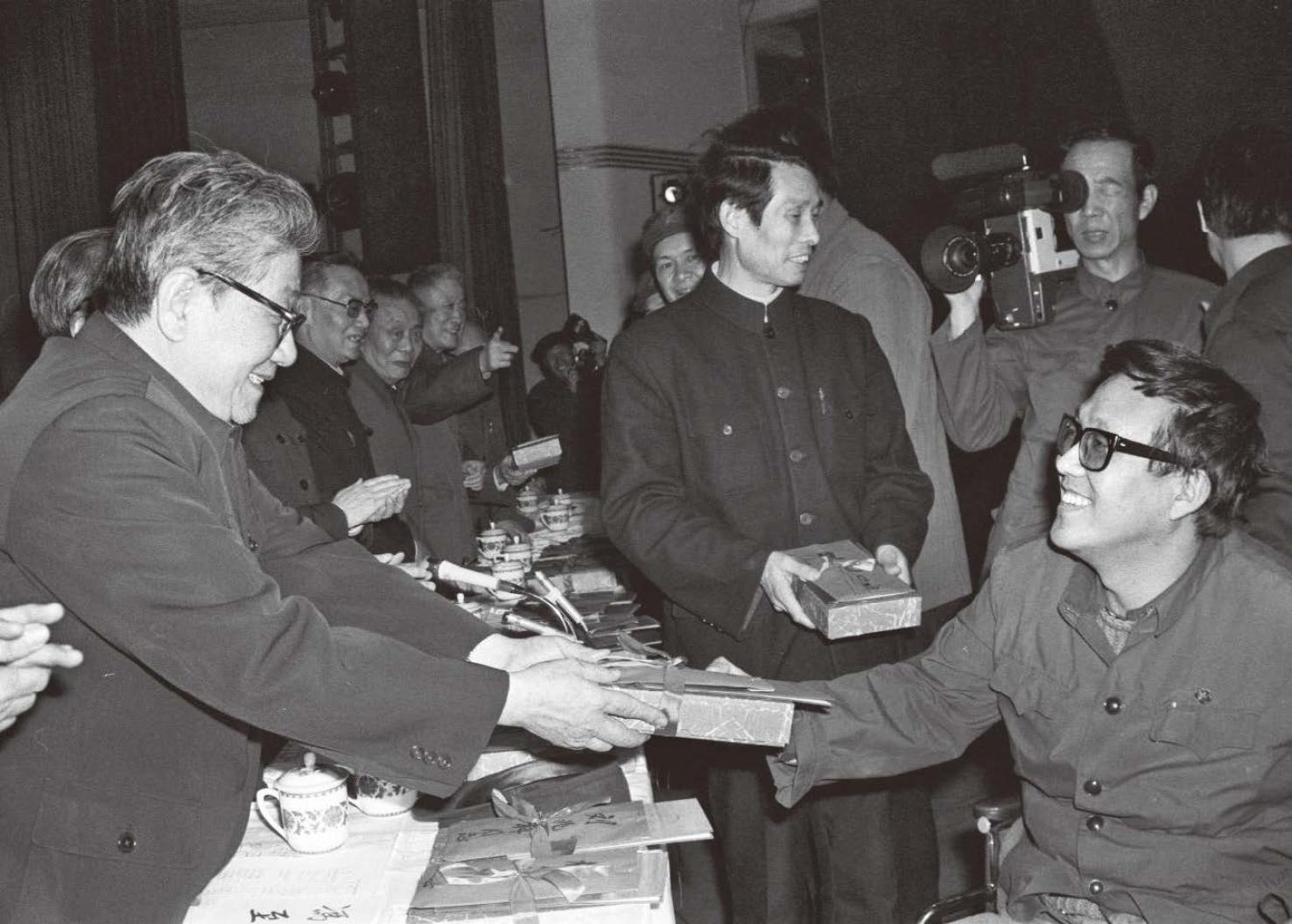 1983年,史鐵生(右一)的《我的遙遠(yuǎn)的清平灣》獲得全國(guó)優(yōu)秀短篇小說獎(jiǎng)。圖為1984年3月19日,他在北京參加授獎(jiǎng)大會(huì),坐著輪椅上臺(tái)領(lǐng)獎(jiǎng)。(新華社記者 張桂玉/攝)