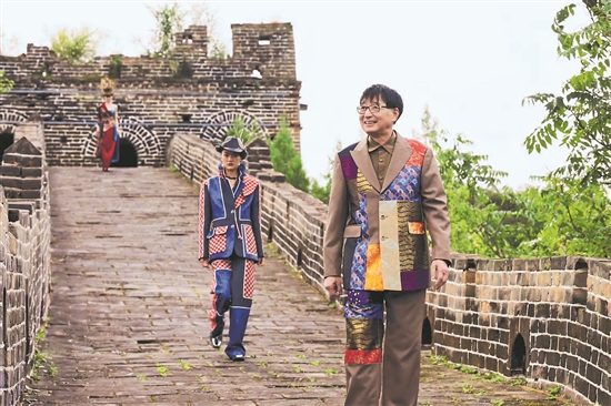 近日,在2026春夏北京時(shí)裝周閉幕大秀上,朱炳仁(右一)身著自己設(shè)計(jì)的“熔裝”和模特一起亮相司馬臺(tái)長(zhǎng)城。受訪(fǎng)者供圖
