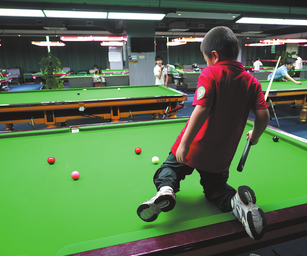 Wu Yiren often climbs onto the table to practice at Li Jianbing's snooker school in Dongguan, South China's Guangdong province, on April 21, 2025. CHEN FAN/FOR CHINA DAILY
