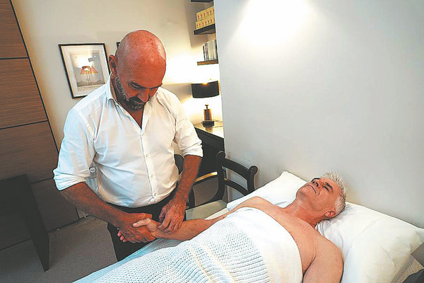 Acupuncturist Gerad Kite performs pulse diagnosis for James Eden, a film producer and also co-writer of new book The Untapped Self, in London, on Sept 4. [Photo/Xinhua]