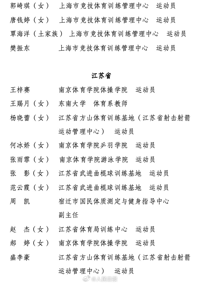 其中公示對象包含孫穎莎、樊振東、馬龍、王楚欽、王曼昱、覃海洋、隋文靜、武大靖、盛李豪、潘展樂、全紅嬋、陳芋汐、唐錢婷、張雨霏、王昶、梁偉鏗、鄭思維、黃雅瓊、陳夢、鄭欽文等運動員。