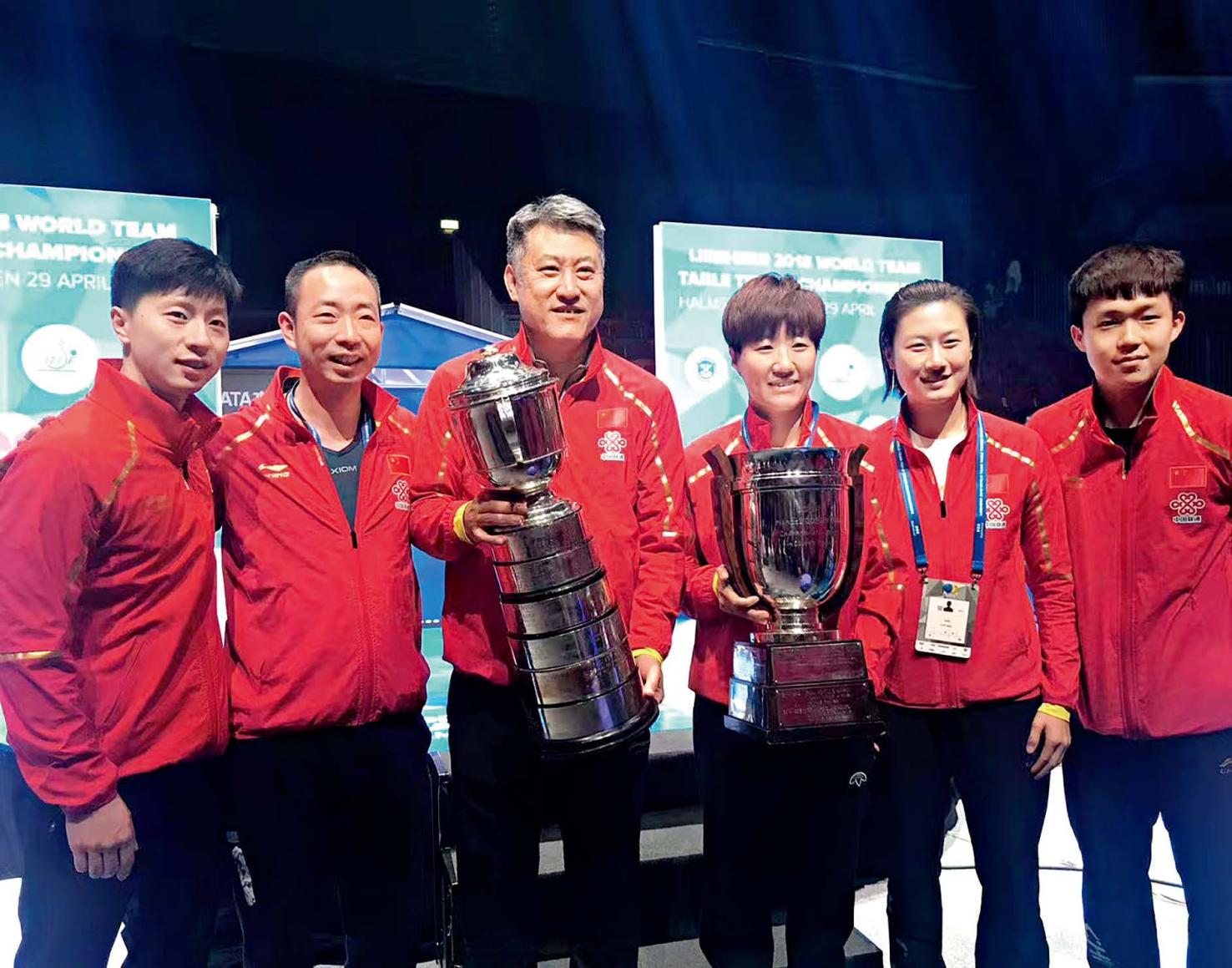 2017年瑞典世錦賽上,北京籍隊員和教練合影。從左至右依次是:馬龍、教練關亮、教練張雷、郭炎、丁寧、王楚欽。(北京乒乓球隊供圖)